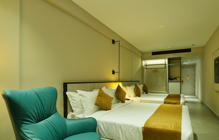 The 300-sq. ft. Opus Family Room in Wayanad is designed for up to five adults and one child. We can accommodate an additional adult with an extra mattress available for an additional charge. This spacious and inviting retreat combines comfort, style, and convenience, ensuring everyone feels right at home. Featuring both a queen size and a king size bed, the room provides ample space for parents and kids to unwind. With premium mattresses, crisp linens, and plush pillows, along with a suite of modern amenities, your family's stay will be as relaxing as it is memorable.